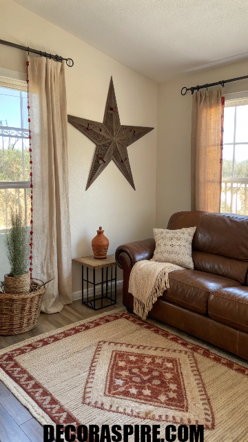 Star-shaped wall decor adds subtle Western flair. A single iron star fits small walls perfectly. It creates a simple yet striking focal point. This decor enhances the room’s rustic charm. It pairs well with neutral furniture. Keep the wall clear to avoid clutter. The star evokes Western night skies. It feels bold and authentic. Add a leather sofa for balance. This design maximizes wall space. It feels cozy and inviting. The star ties the Western theme together.