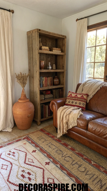 A Navajo rug brings vibrant Western patterns to the floor. Bold geometric designs in red and black pop against neutral furniture. It anchors the room with cultural depth. This rug fits small spaces without overwhelming them. Its flat weave keeps the room open. Pair it with a simple sofa for balance. The rug’s colors evoke desert landscapes. It connects the room to Western heritage. Add a small pottery vase for authenticity. This design feels warm and grounded. It maximizes style in limited space. The rug ties the room together.