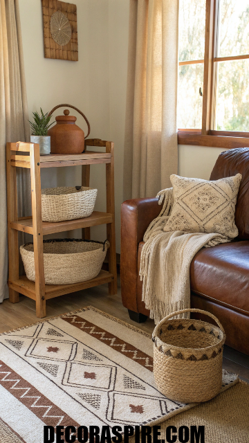 Handwoven basket storage adds rustic Western function. Baskets on a shelf hold blankets or magazines. They bring texture without cluttering the space. This storage fits small rooms perfectly. It keeps the floor open and tidy. Pair it with a leather sofa for balance. The baskets evoke traditional craftsmanship. They feel earthy and practical. Add a small cactus for charm. This design maximizes storage space. It feels cozy and organized. The baskets enhance the Western aesthetic.