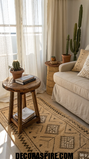 A rustic wooden stool adds versatile Western charm. Its worn wood finish fits small spaces perfectly. Use it as a side table or extra seating. This stool creates a functional focal point. It pairs well with neutral furniture. Keep the decor minimal for balance. The wood evokes old ranch aesthetics. It feels sturdy and timeless. Add a woven throw for warmth. This design keeps the room open. It feels cozy and practical. The stool enhances the Western aesthetic.