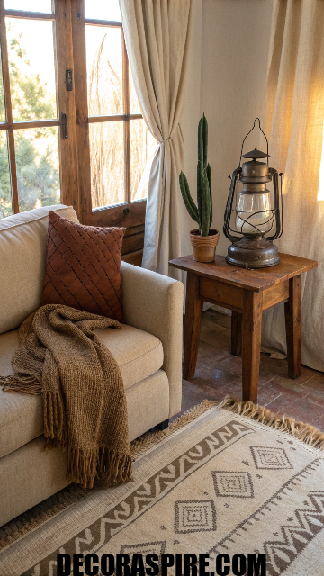 Vintage lantern lighting adds rustic Western charm. A single lantern on a side table casts a warm glow. It creates a cozy focal point in small spaces. This lighting fits compact rooms perfectly. It adds style without taking up space. Pair it with a neutral sofa for balance. The lantern evokes old Western ranches. Its soft light feels inviting. Add a woven throw for extra warmth. This design keeps the room open. It feels authentic and cozy. The lantern enhances the Western vibe.