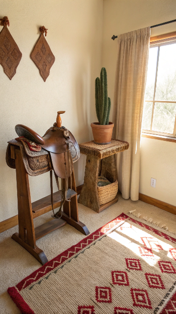 A vintage saddle display adds authentic Western character. Mount a worn leather saddle on a wooden stand. It becomes a unique conversation piece. This decor choice fits small rooms perfectly. It uses vertical space without crowding the floor. Pair it with a neutral rug for balance. The saddle evokes ranch life and history. Its weathered look tells a story. Add a lasso coil nearby for extra charm. This setup keeps the room functional. It feels open yet richly Western. The display creates a bold focal point.