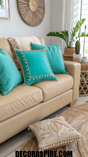 Turquoise accent pillows add a pop of Western color. Their vibrant hue contrasts beautifully with neutral furniture. They bring desert-inspired energy to the room. These pillows work well in small spaces. They add style without taking up space. Pair them with a leather sofa for contrast. Turquoise evokes clear Western skies. It feels fresh and inviting. Add a woven rug to tie it together. This design keeps the room lively. It feels open and cohesive. The pillows create a bold statement.