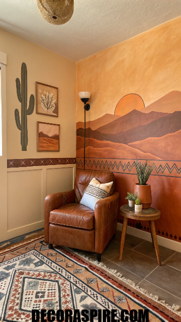 A desert-inspired color palette brings Western warmth to small rooms. Sandy beiges and burnt oranges create a cozy vibe. These colors make the space feel open and inviting. This palette fits compact living rooms perfectly. It adds style without overwhelming the space. Pair it with a leather chair for contrast. The colors evoke desert sunsets. They feel earthy and authentic. Add a small pottery vase for charm. This design keeps the room lively. It feels warm and cohesive. The palette ties the Western theme together.