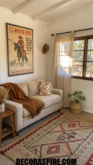A vintage Western poster adds nostalgic charm. A framed cowboy or desert scene fits small walls. It creates a bold focal point without clutter. This decor enhances the room’s Western vibe. It pairs well with neutral furniture. Keep the frame simple for balance. The poster evokes old Western films. It feels authentic and timeless. Add a leather chair for contrast. This design maximizes wall space. It feels cozy and inviting. The poster ties the Western theme together.
