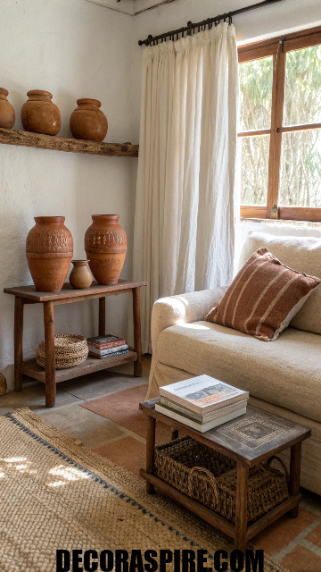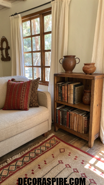 A terracotta pottery collection brings earthy Western vibes. Small pots on a shelf add rustic charm. They fit perfectly in compact spaces. This decor creates a warm focal point. It pairs well with neutral furniture. Keep the arrangement simple to avoid clutter. Terracotta evokes desert landscapes. Its warm tones feel inviting. Add a woven rug for balance. This design maximizes shelf space. It feels cozy and authentic. The pottery ties the room together.