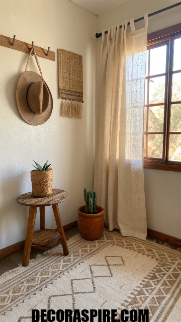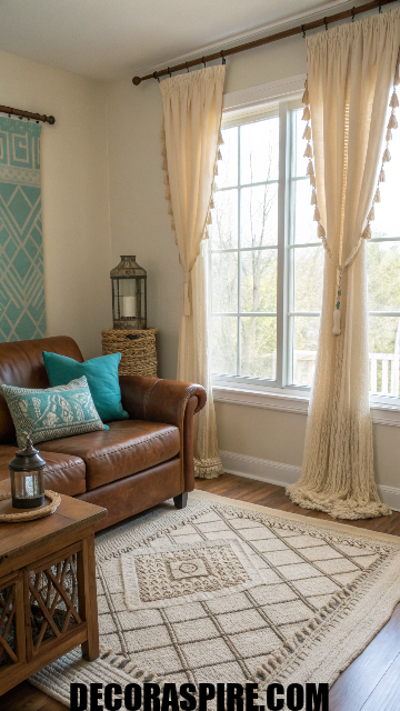 Fringe curtains add playful Western texture. Beige or brown fabric with fringe details softens the room. They fit small spaces without overwhelming them. These curtains create a cozy focal point. They pair well with neutral furniture. Keep other decor simple for balance. The fringe evokes cowboy aesthetics. It feels rustic yet stylish. Add a woven rug for warmth. This design keeps the room open. It feels inviting and authentic. The curtains enhance the Western vibe.