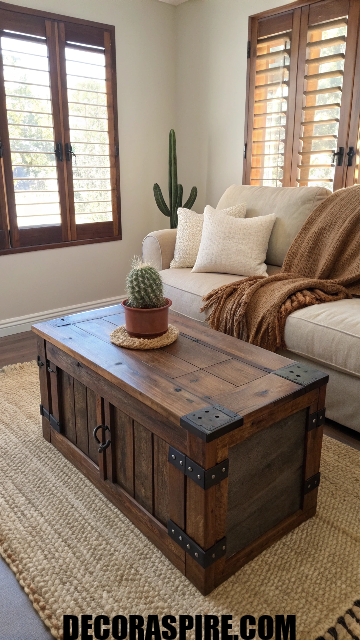 A barn door coffee table brings rustic charm to small spaces. Its weathered wood surface adds texture and history. Simple iron hardware enhances the Western look. This table fits perfectly in compact rooms. It provides function without dominating the space. Pair it with a neutral sofa for balance. The table evokes old ranch aesthetics. Its sturdy design feels timeless. Add a small cactus for extra flair. This piece keeps the room open. It feels cozy and authentic. The table anchors the Western theme.