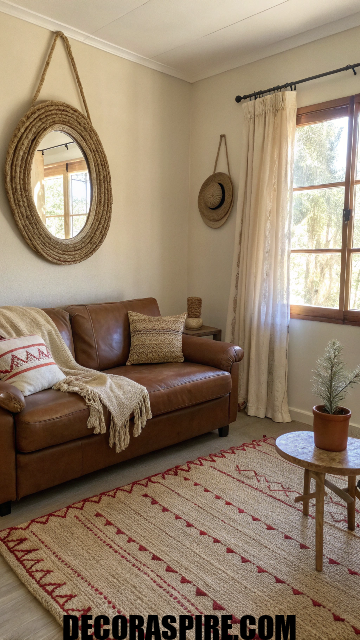 A rope-trimmed mirror adds Western flair to small spaces. The woven rope frame feels rustic and unique. It reflects light to make the room feel larger. This mirror fits perfectly in compact rooms. It hangs on a wall without taking floor space. Pair it with a leather sofa for balance. The rope evokes cowboy lassos. It adds texture and charm. Add a small cactus for extra style. This design keeps the room open. It feels inviting and authentic. The mirror enhances the Western theme.