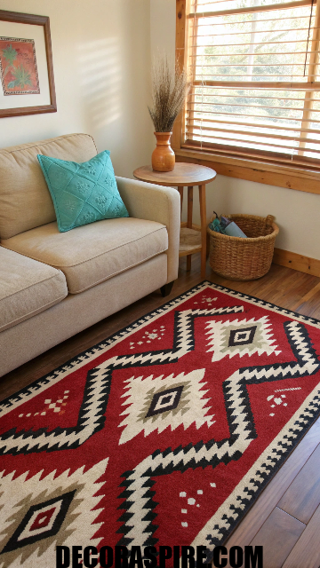 A Navajo rug brings vibrant Western patterns to the floor. Bold geometric designs in red and black pop against neutral furniture. It anchors the room with cultural depth. This rug fits small spaces without overwhelming them. Its flat weave keeps the room open. Pair it with a simple sofa for balance. The rug’s colors evoke desert landscapes. It connects the room to Western heritage. Add a small pottery vase for authenticity. This design feels warm and grounded. It maximizes style in limited space. The rug ties the room together.